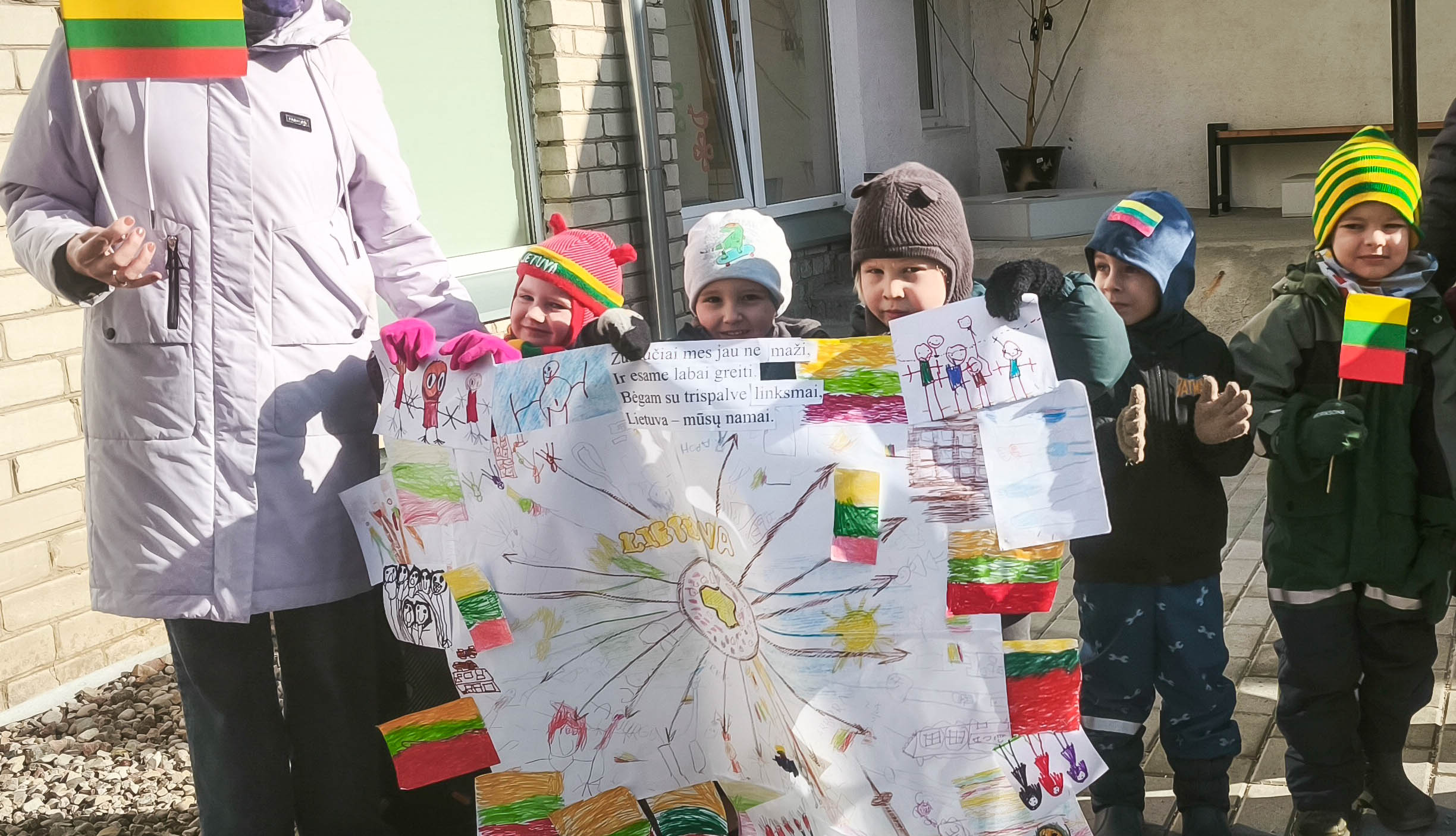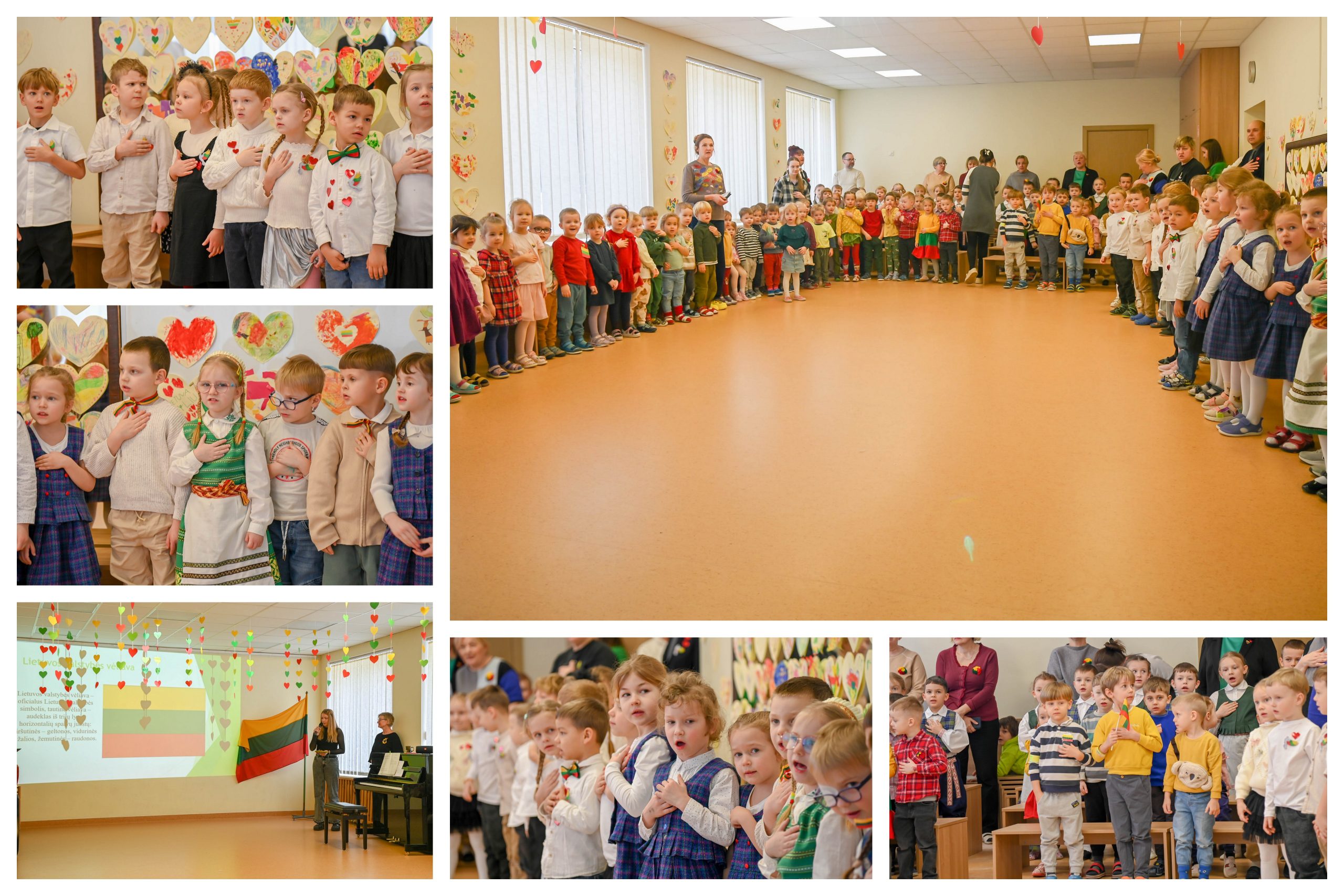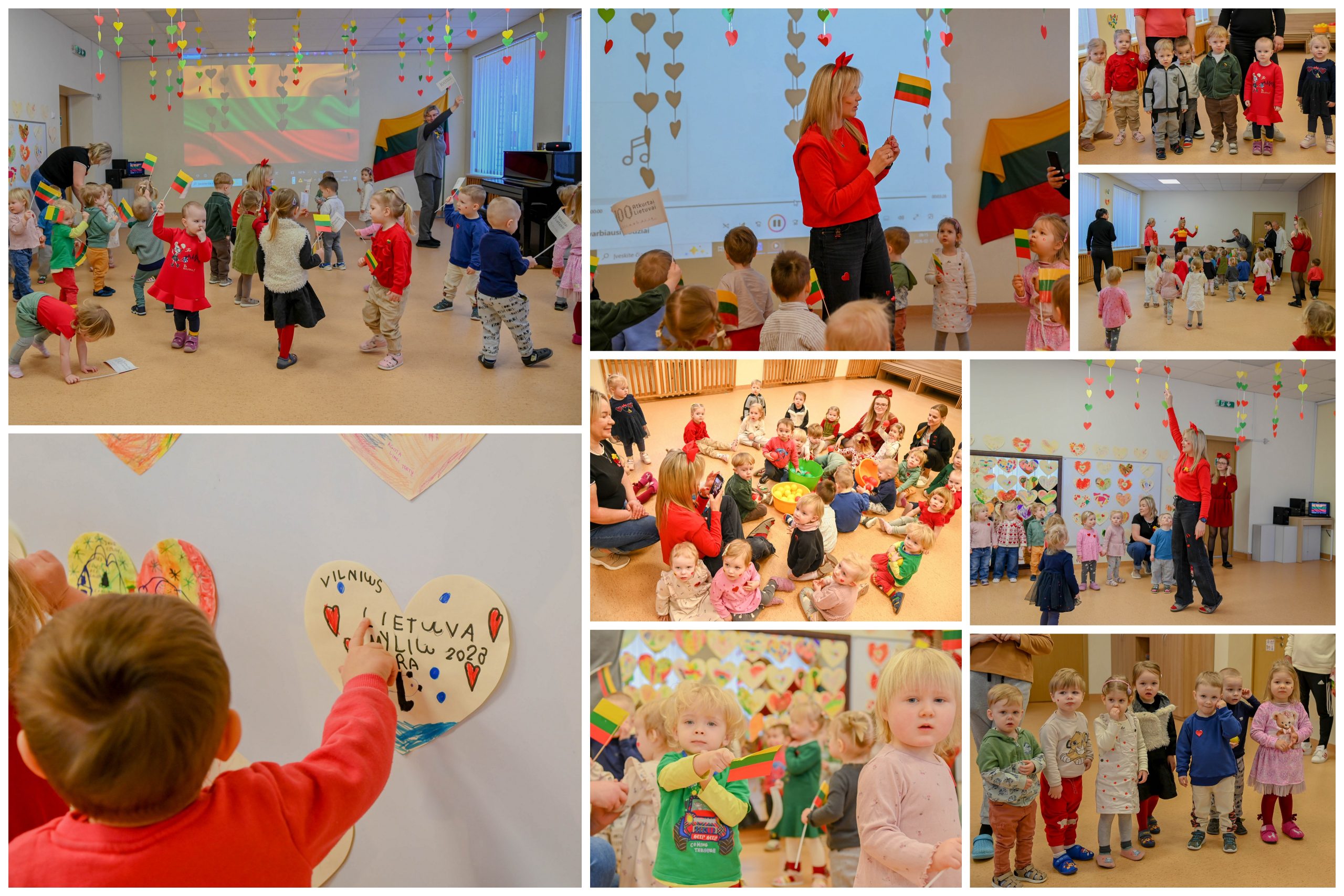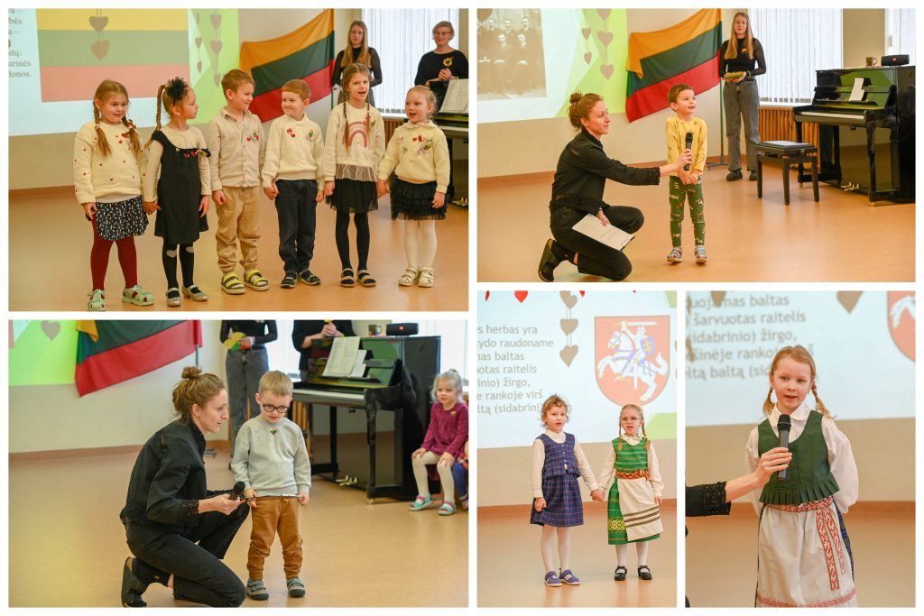 Pakiliai nusiteikę visi kartu sugiedojome Lietuvos valstybės himną, vaikai dainų akordais, šokių sūkuriu, patarlėmis, eilėraščiais sveikino Lietuvą.