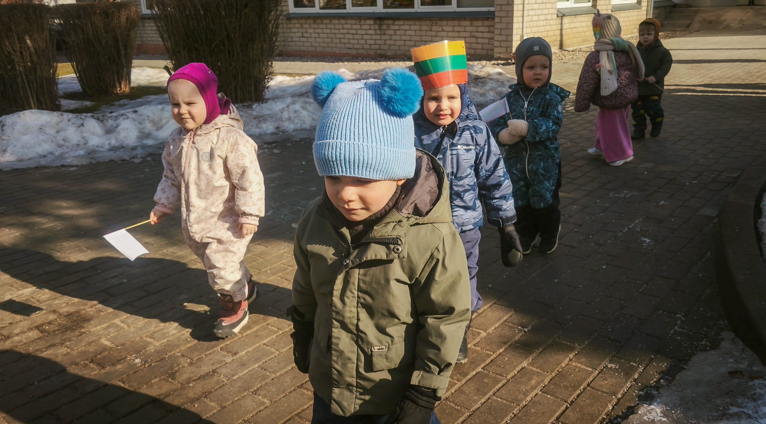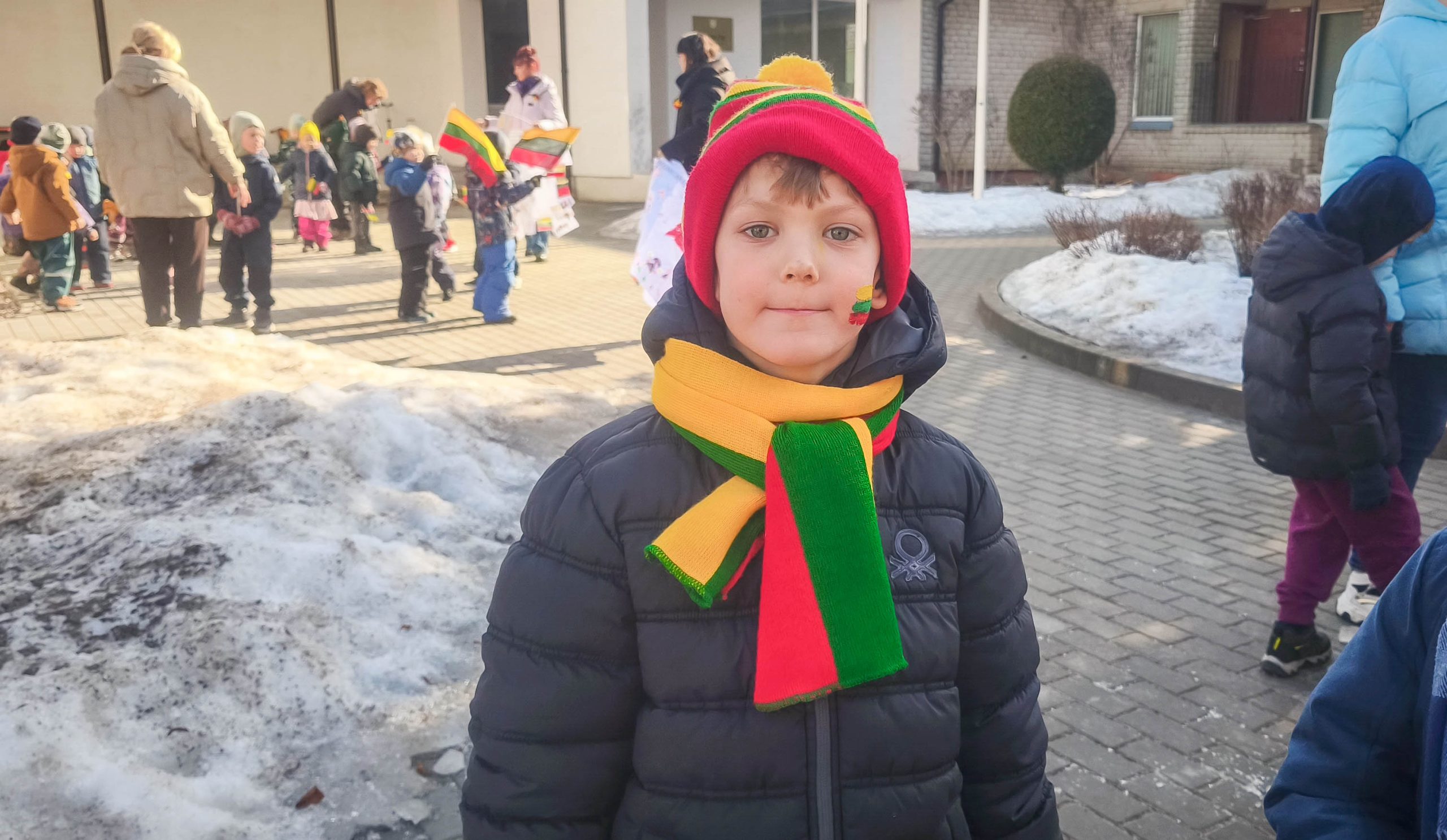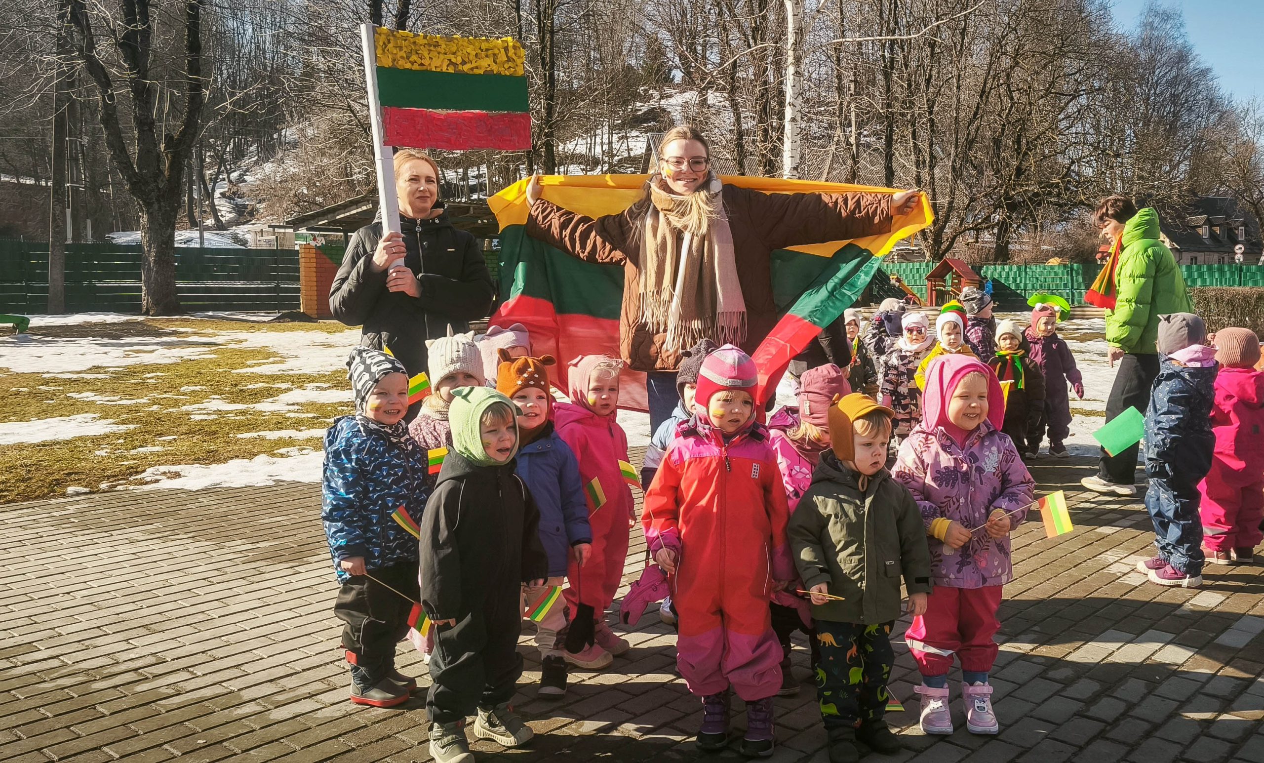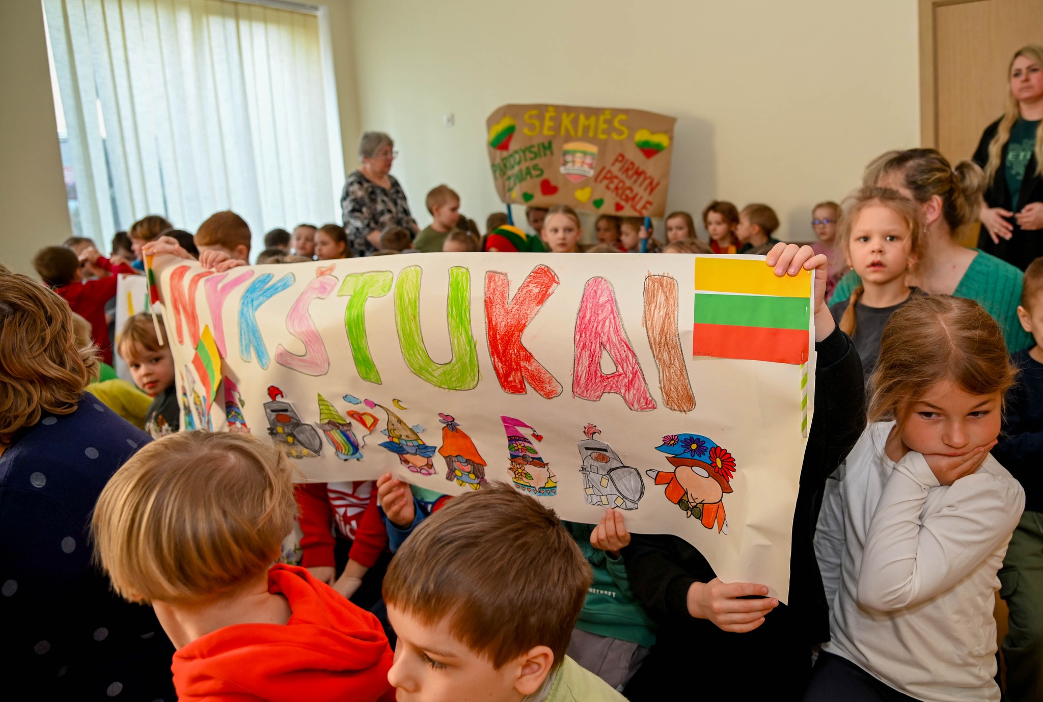 Pakiliai nusiteikę visi kartu sugiedojome Lietuvos valstybės himną, vaikai dainų akordais, šokių sūkuriu, patarlėmis, eilėraščiais sveikino Lietuvą.